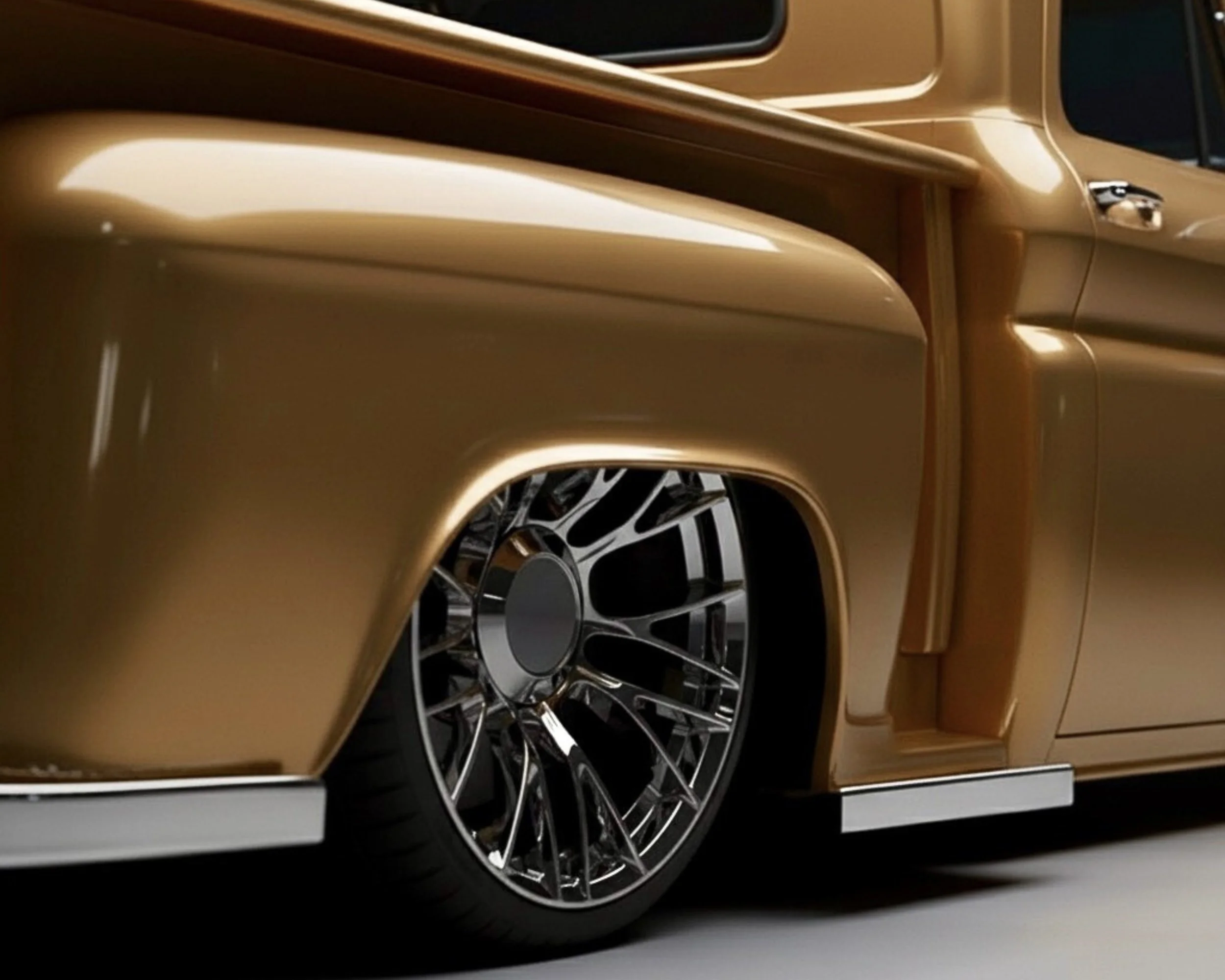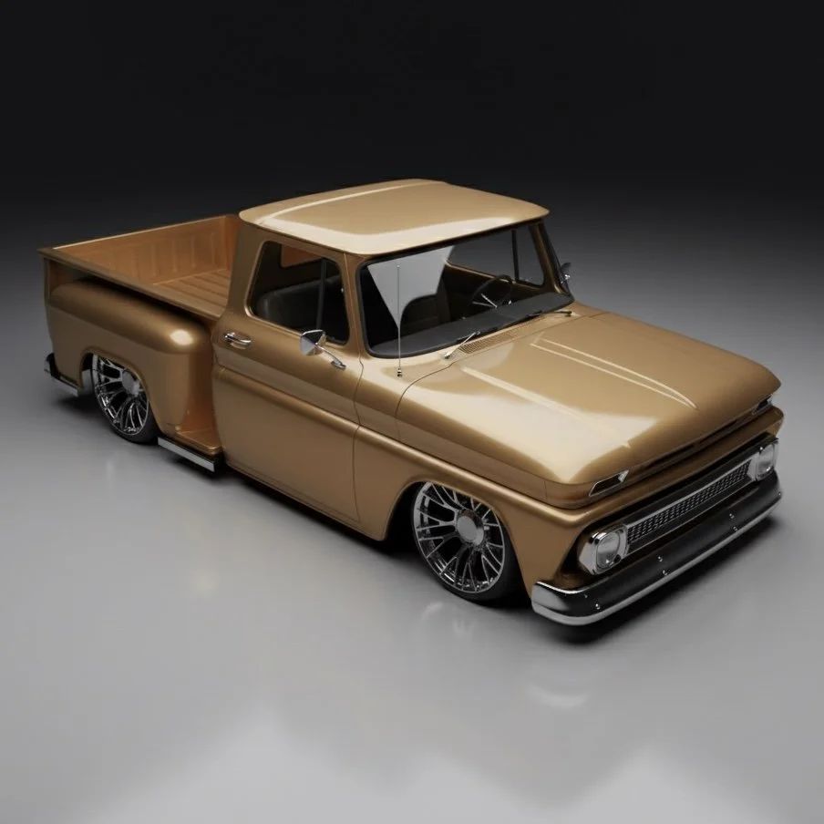 A collaborative design with Mark for his Chevy pickup. Wheels are In-Production and studio product stills coming soon 🔜 (66 C-10 is AI)
